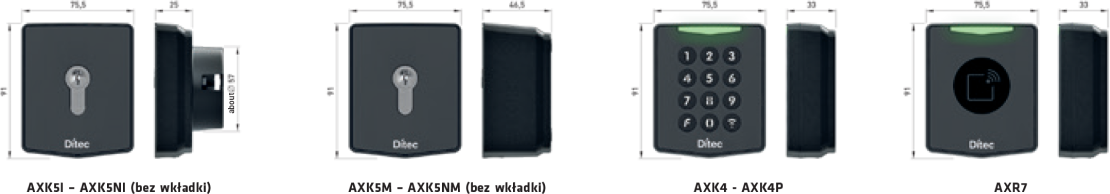 Kompatybilne z fotokomórkami serii AX, pół-podtynkowymi przełącznikami kluczowymi, klawiaturami numerycznymi, czujnikami zbliżeniowymi RFID
