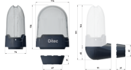 Ditec FL to lampa ostrzegawcza ze zintegrowaną diodą LED. Prawidłowo skonfigurowana za pomocą panelu sterowania ostrzega użytkowników, że brama się porusza, zmniejszając zagrożenia; może inaczej błyskać podczas otwierania i zamykania; wskazuje kierunek ruchu i sygnalizuje osiągnięcie zaprogramowanych limitów konserwacyjnych.