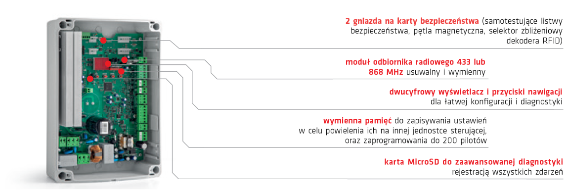 2 dedykowane wejścia dla pozycji otwarcia i zamknięcia do automatycznego testowania oporowej listwy bezpieczeństwa (8,2kΩ)