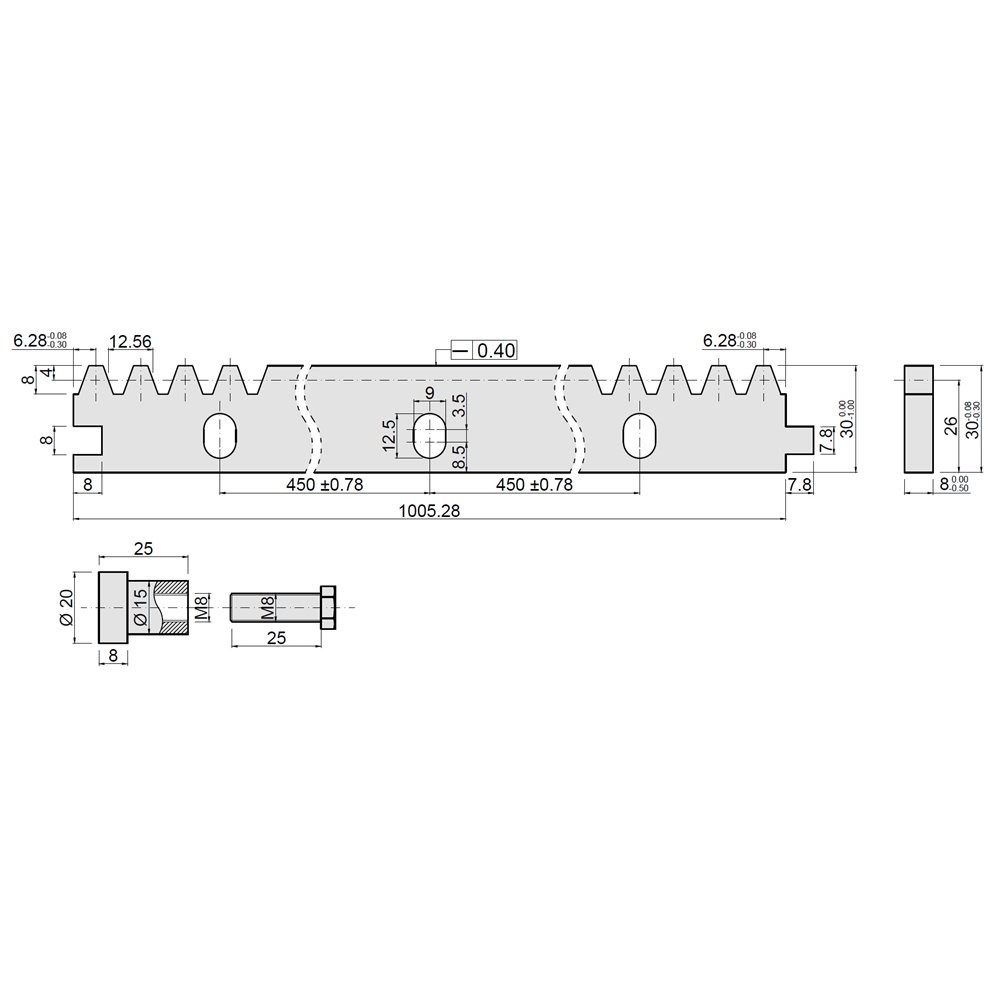 Listwa zębata galwanizowana z zamkiem M4 8x30x1000mm ze śrubami i tulejami gwinowanymi, do spawania